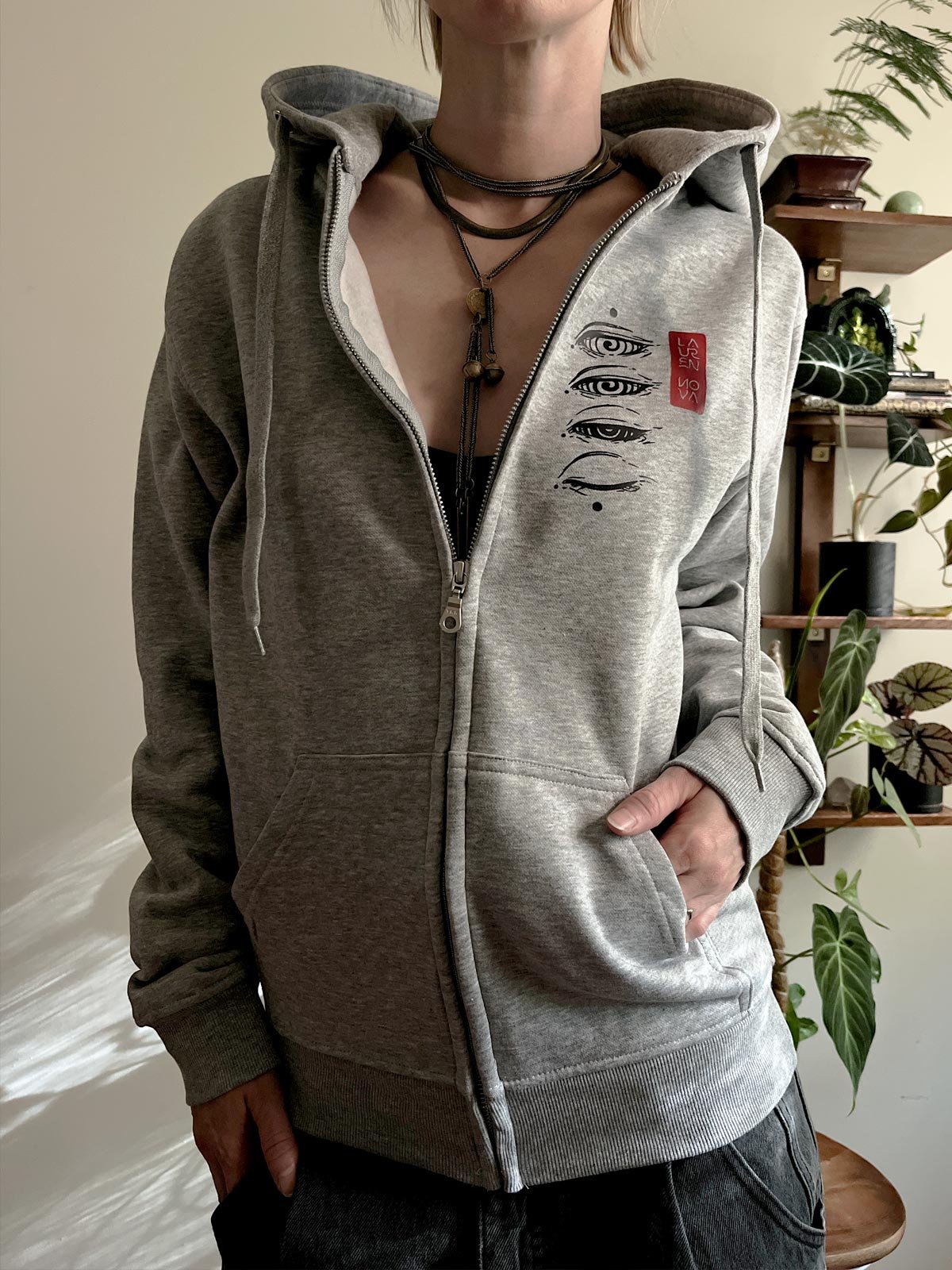 - Unisex zip-up hoodie printed on the front with "Lucid Waker" ink painting by Lauren Nova