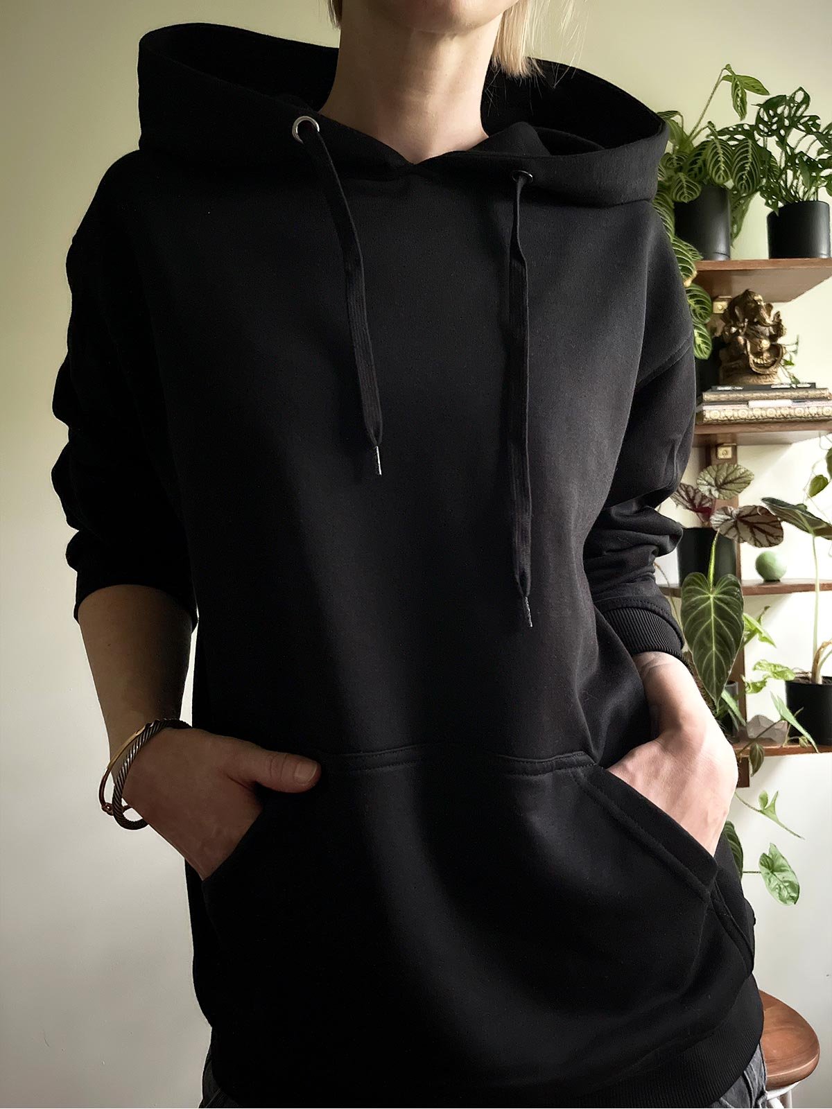 The archimedean spiral embarks on an undulating journey through the threads of this ultra cozy black pullover hoodie with a soft cotton outer layer, plush polyester inner layers, and a double fleece lined hood.