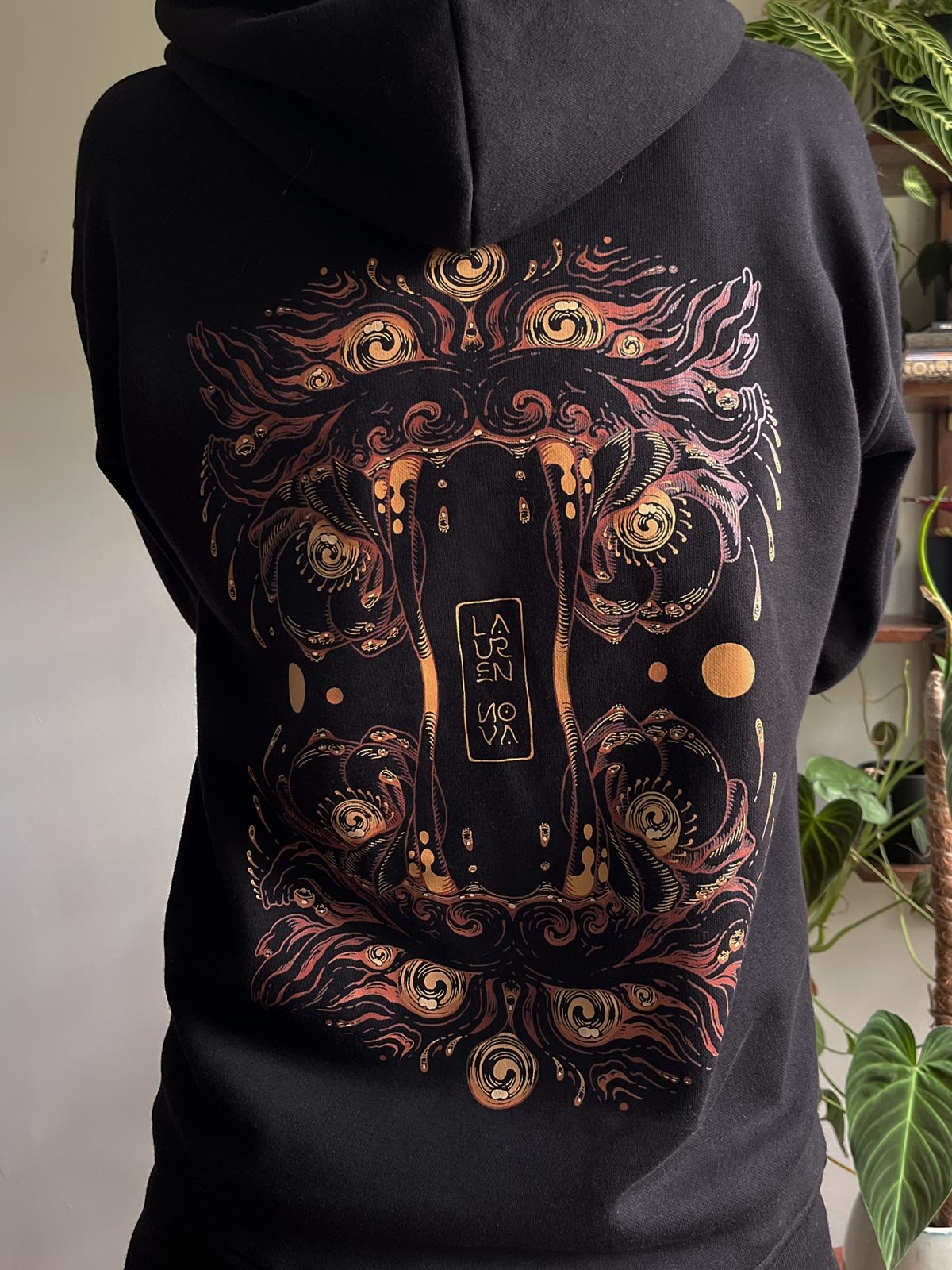Eye stack design printed on an ultra cozy zip-up hoodie with a soft cotton outer layer, plush polyester inner layers, and a double fleece lined hood.